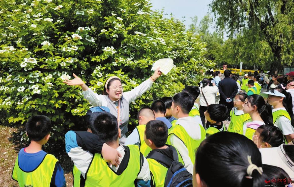 初夏時(shí)節(jié),忻府區(qū)花開(kāi)正艷、氣候宜人,孩子們走出校園,開(kāi)啟了一場(chǎng)別開(kāi)生面的研學(xué)之旅,在大自然中增長(zhǎng)知識(shí)、收獲成長(zhǎng)?;顒?dòng)中,孩子們?cè)诶蠋煹膸ьI(lǐng)下,了解本地植物種類和生態(tài)鏈相關(guān)知識(shí),認(rèn)真填寫研學(xué)手冊(cè)。圖為5月10日,參加研學(xué)活動(dòng)的學(xué)生在人民公園聽(tīng)老師講解植物特性。 (記者 張存良攝)