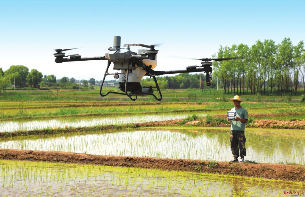 6月13日,原平市吉祥街道東營村,飛手操作植保無人機對水稻秧苗和蓮藕噴藥施肥。“三夏”時節(jié),原平市加大農(nóng)作物管護力度,調(diào)配植保無人機開展飛防作業(yè),組織農(nóng)技人員指導(dǎo)農(nóng)戶高效施肥、精準(zhǔn)噴藥,實現(xiàn)水稻科學(xué)管護,為糧食穩(wěn)產(chǎn)高產(chǎn)筑牢基礎(chǔ)。(褚震攝)