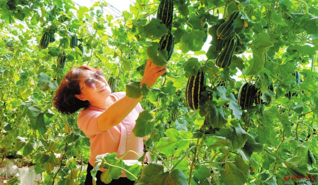 定襄縣大南莊村香瓜種植專業(yè)戶利用南瓜根系嫁接香瓜新技術(shù),實(shí)現(xiàn)了穩(wěn)產(chǎn)增產(chǎn),畝均收益5萬(wàn)元以上。圖為游客在采摘香瓜。(張晉蘭攝