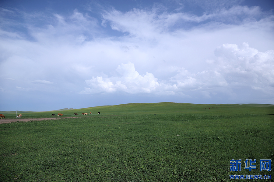 8月2日,其日麥拉圖家的幾頭牛在草場(chǎng)上吃草。新華網(wǎng)記者 焦鵬攝