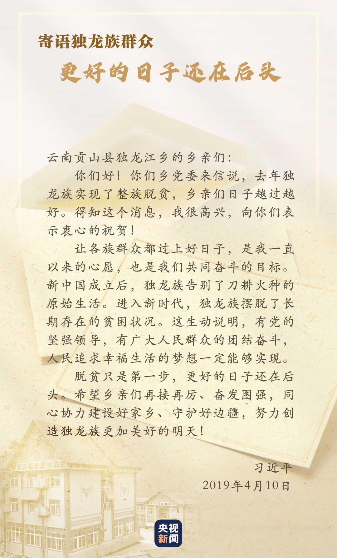 2018年,獨(dú)龍江鄉(xiāng)6個(gè)行政村整體脫貧,獨(dú)龍族實(shí)現(xiàn)整族脫貧,基礎(chǔ)設(shè)施、特色產(chǎn)業(yè)、社會(huì)事業(yè)等都發(fā)生了巨大變化。貢山縣干部群眾再次給習(xí)近平寫信匯報(bào)脫貧成績(jī),習(xí)近平得知后非常高興,向他們表示“衷心的祝賀”,并勉勵(lì)鄉(xiāng)親們?yōu)檫^(guò)上更加幸福美好的生活繼續(xù)團(tuán)結(jié)奮斗。