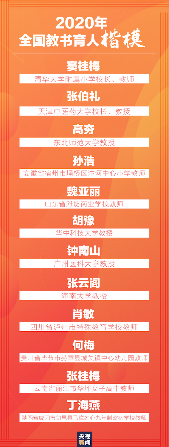 9月4日,2020年全國教書育人楷模名單發(fā)布,首次由中宣部和教育部聯(lián)合表彰,首次增加2個(gè)優(yōu)秀抗疫教師名額,共計(jì)推出12位“全國教書育人楷?!?。