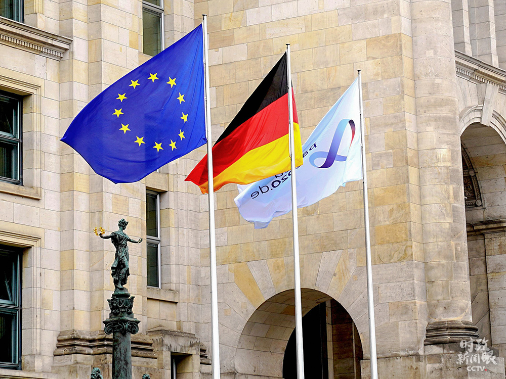 △今年7月1日起,德國接任歐盟輪值主席國,為期半年。這是德國國會大廈前從左到右依次掛出代表歐盟、德國和德國擔任歐盟輪值主席國的三面旗幟。