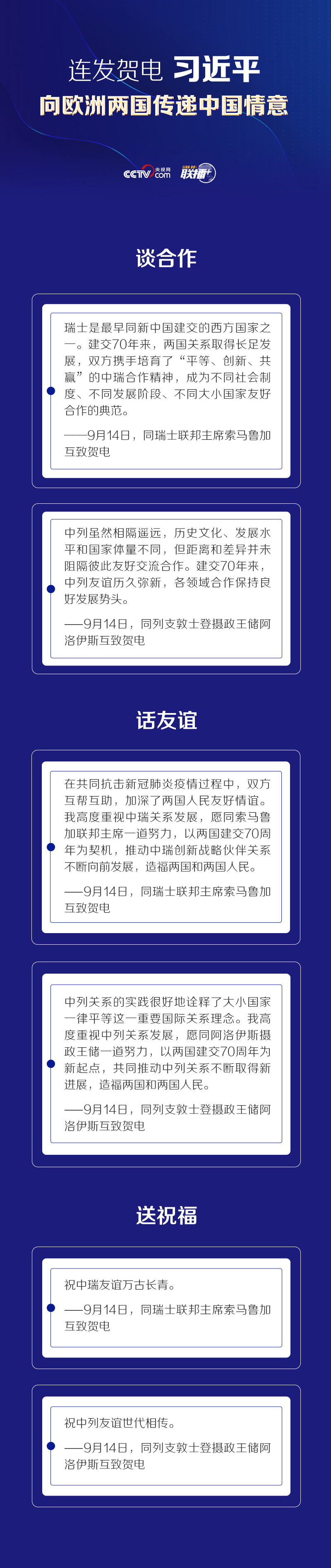 9月14日,習近平主席就中瑞、中列建交70周年,分別同瑞士聯邦主席索馬魯加、列支敦士登攝政王儲阿洛伊斯互致賀電。