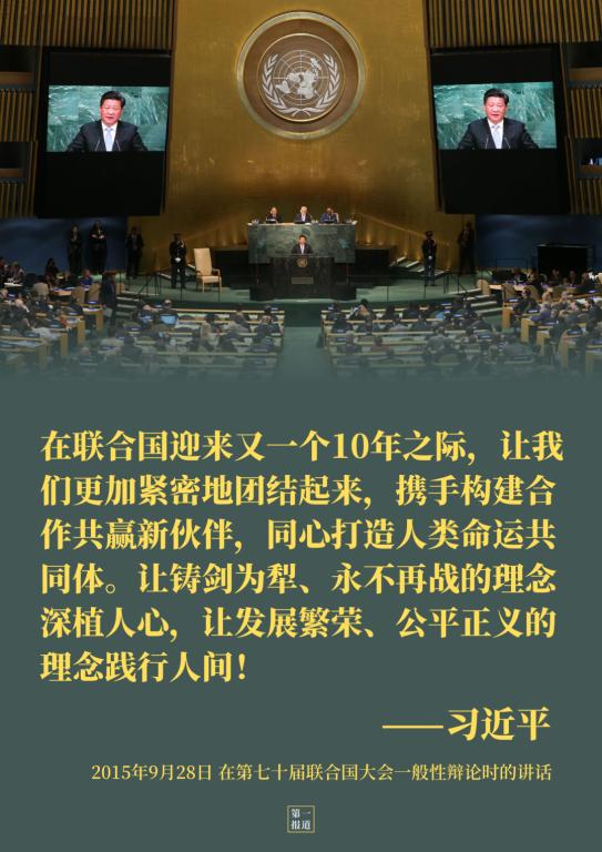 講話中,習(xí)主席回顧聯(lián)合國發(fā)展歷程,重溫《聯(lián)合國憲章》精神,提出“攜手構(gòu)建合作共贏新伙伴,同心打造人類命運(yùn)共同體”的中國倡議。