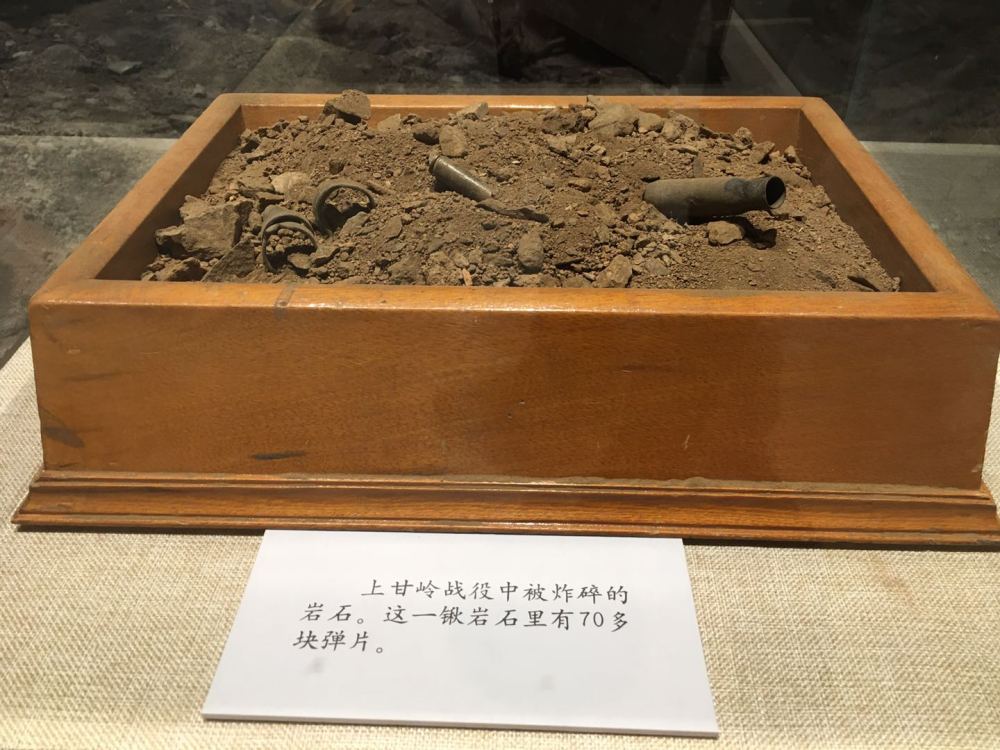 在軍博的主題展覽“血戰(zhàn)上甘嶺”展區(qū),幾件戰(zhàn)場(chǎng)實(shí)物似乎還能讓人聞到當(dāng)年的殘酷硝煙:一截嵌滿彈片的枯樹(shù)干,一堆摻雜著彈片的碎石焦土,被炸斷50多處的200多米電話線……