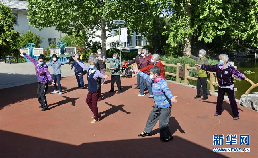 北京海淀區(qū)四季青鎮(zhèn)敬老院的老人們在學習跳舞(2020年5月10日攝)。新華社記者 李欣 攝