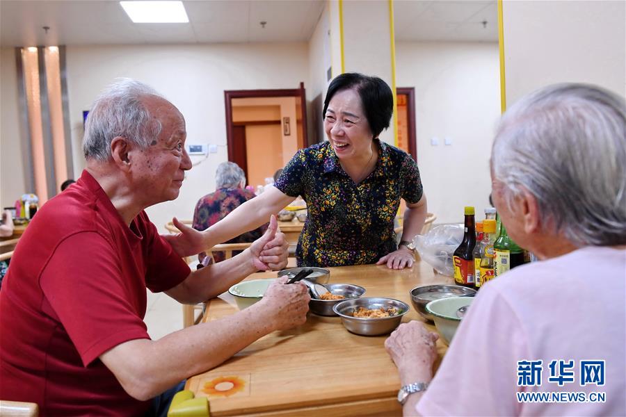 福州市鼓樓區(qū)東街街道軍門社區(qū)老人劉建國(左)在社區(qū)居家養(yǎng)老服務照料中心就餐(2019年7月30日攝)。新華社記者 林善傳 攝