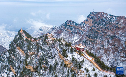 在山西省永濟(jì)市五老峰景區(qū)拍攝的雪景(3月4日攝,無人機(jī)照片)。(新華社發(fā) 薛俊 攝)