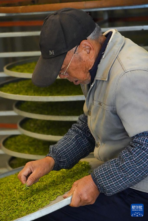 3月10日,在新昌縣東茗鄉(xiāng)下巖貝村的一家茶葉加工廠,工作人員在挑揀茶葉。(新華社記者 翁忻旸 攝)