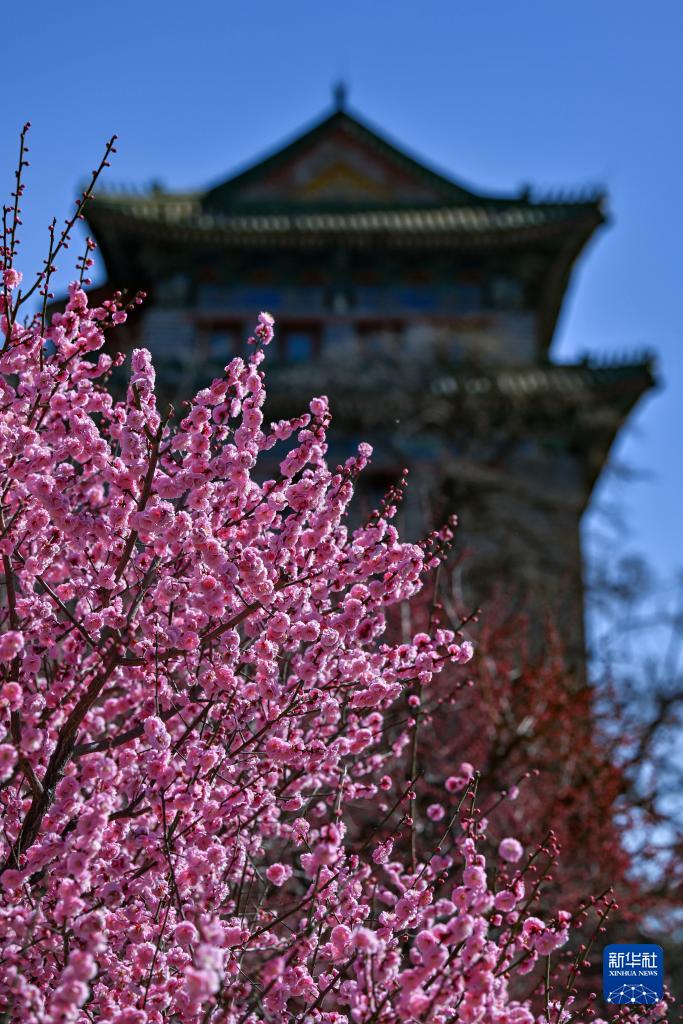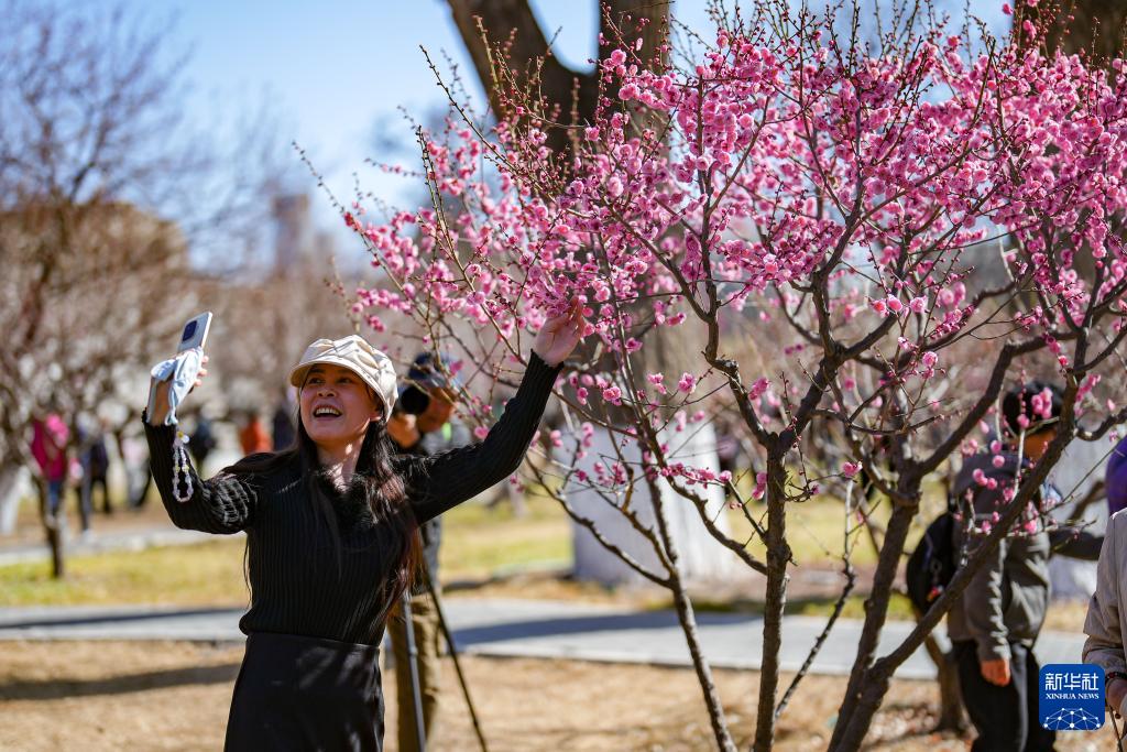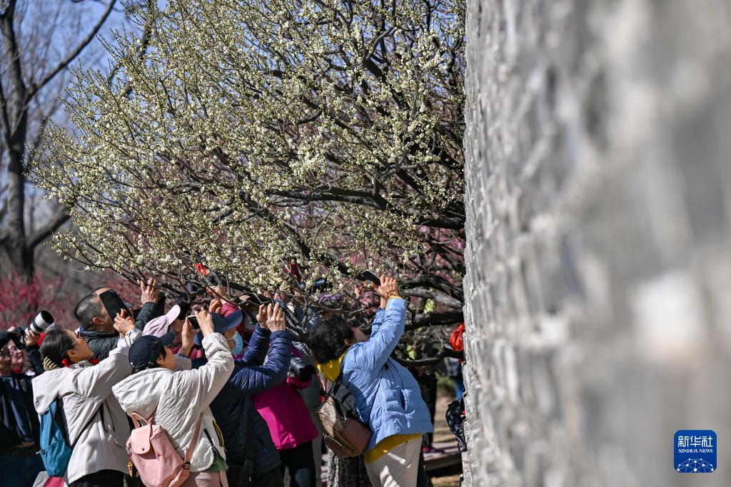 3月12日,人們?cè)诒本┟鞒菈z址公園賞花拍照。(新華社記者 張鋮 攝)
