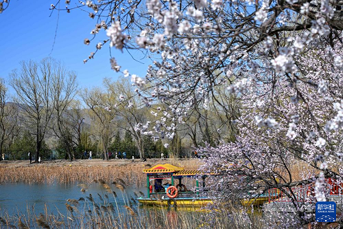 3月16日,游客在北京頤和園乘船賞花游玩。(新華社記者 張鋮 攝)