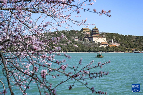 3月16日,游客在北京頤和園踏青賞花。(新華社記者 張鋮 攝)