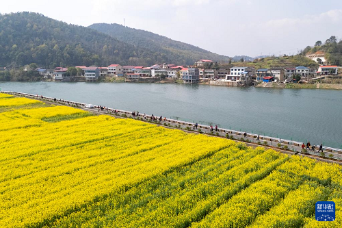 3月16日,在湖南省婁底市雙峰縣杏子鋪鎮(zhèn)漣水村,游客暢游花海(無人機照片)。(新華社發(fā) 吳永華 攝)