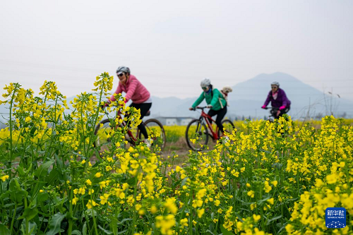 3月16日,騎行愛好者在安徽省蕪湖市繁昌區(qū)峨山鎮(zhèn)城東村的油菜花田間騎行。(新華社發(fā) 肖本祥 攝)