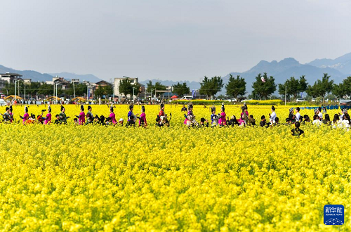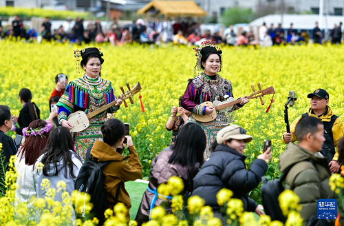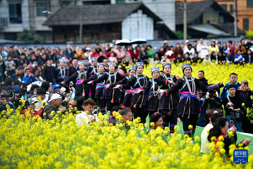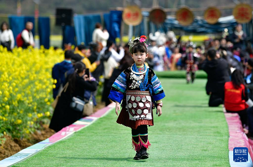 3月16日,在貴州省黔東南苗族侗族自治州榕江縣車江大壩,一場以“村秀·秀未來”為主題的民族服裝秀在花田間舉行。服裝秀以村民為主角,以花田為舞臺,展示黔東南多姿多彩的民族文化。