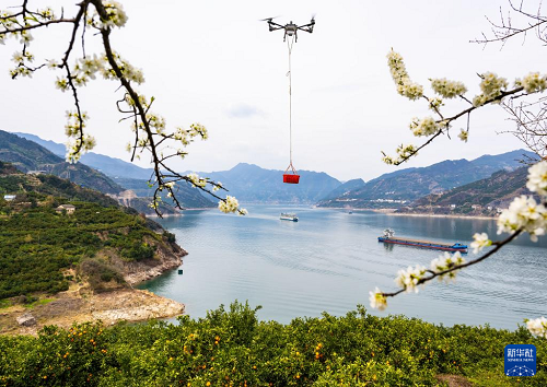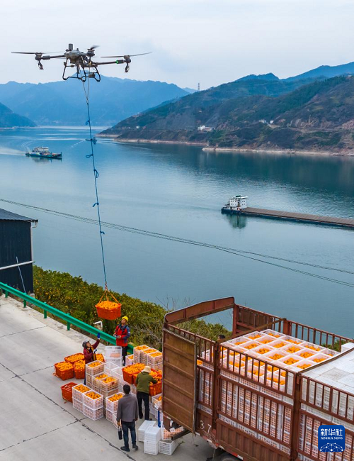 3月17日,湖北省秭歸縣郭家壩鎮(zhèn)鄧家坡村村民用無(wú)人機(jī)轉(zhuǎn)運(yùn)臍橙。(新華社發(fā) 鄭家裕 攝)