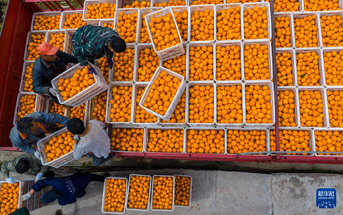 3月17日,湖北省秭歸縣郭家壩鎮(zhèn)鄧家坡村村民將剛收獲的臍橙裝車外運(yùn)(無(wú)人機(jī)照片)。(新華社發(fā) 鄭家裕 攝)