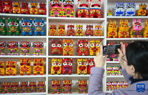 3月19日,一名參觀者在姜莊鎮(zhèn)用手機(jī)拍攝泥老虎產(chǎn)品。(新華社記者 徐速繪 攝)