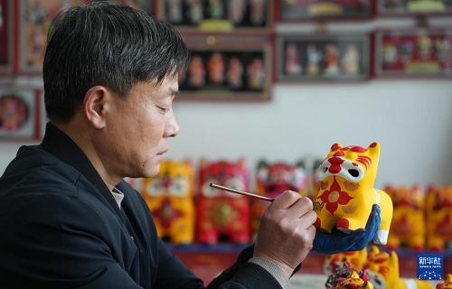 3月19日,一名村民在姜莊鎮(zhèn)制作泥老虎產(chǎn)品。(新華社記者 徐速繪 攝)