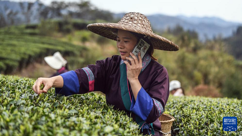 在三江侗族自治縣同樂苗族鄉(xiāng)寨大村茶園,一名茶農(nóng)在給收青點報告當天茶青采摘量(3月21日攝)。(新華社記者 張愛林 攝)