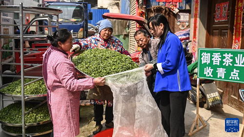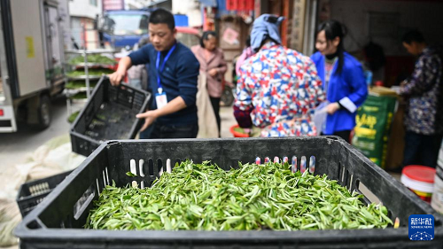3月22日,在三江侗族自治縣獨峒鎮(zhèn)八協(xié)村,茶農(nóng)在御香茶業(yè)收青點出售茶青。(新華社記者 張愛林 攝)