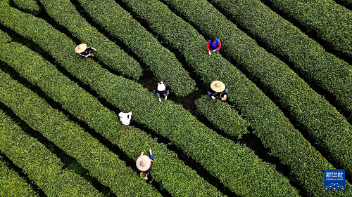 三江侗族自治縣同樂苗族鄉(xiāng)寨大村的茶農(nóng)在山上采茶(3月21日攝,無人機照片)。(新華社記者 張愛林 攝)