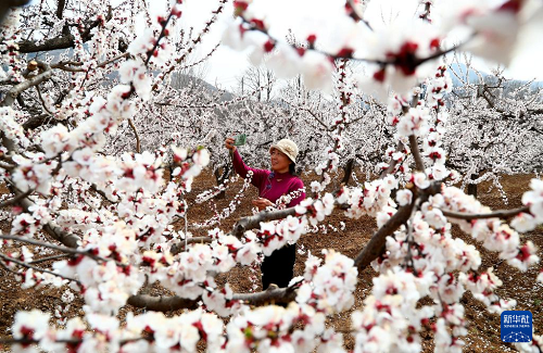3月23日,游人在山東省棗莊市山亭區(qū)山城街道老樸山村杏園游玩。(新華社發(fā) 張強(qiáng) 攝)
