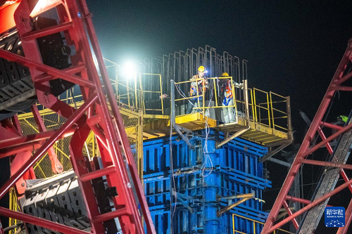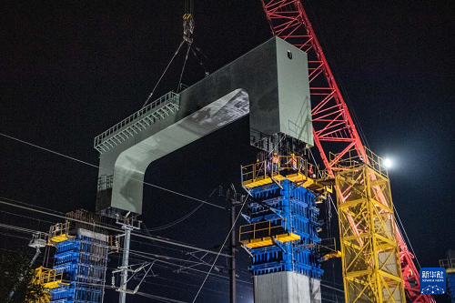 3月27日,在成達(dá)萬(wàn)高鐵建設(shè)現(xiàn)場(chǎng),施工人員在進(jìn)行高鐵鋼橫梁吊裝作業(yè)。(新華社記者 唐奕 攝)