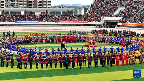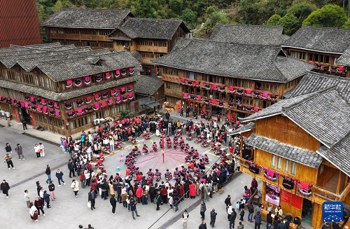 3月31日,當?shù)厝罕娫趶V西三江侗族自治縣古宜鎮(zhèn)表演民族歌舞(無人機照片)。(新華社發(fā) 吳練勛 攝)
