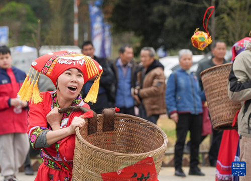3月31日,在廣西融水苗族自治縣三防鎮(zhèn)乃文村,村民參加拋繡球比賽。(新華社發(fā) 龍濤 攝)