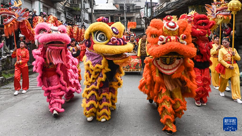 3月31日,龍獅隊在廣西三江侗族自治縣古宜鎮(zhèn)沿街巡演。(新華社記者 張愛林 攝)