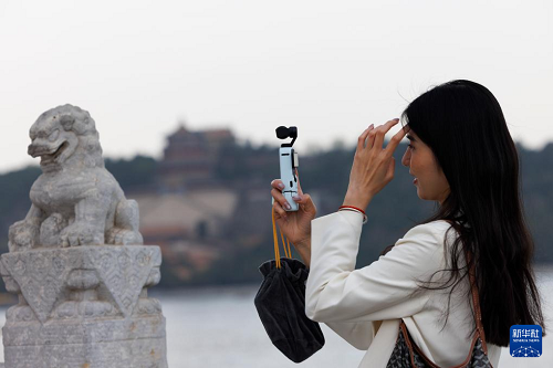 4月9日,一名外國游客在頤和園十七孔橋上拍攝。(新華社記者 金立旺 攝)