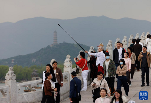 4月9日,游客在頤和園十七孔橋上拍攝。(新華社記者 金立旺 攝)
