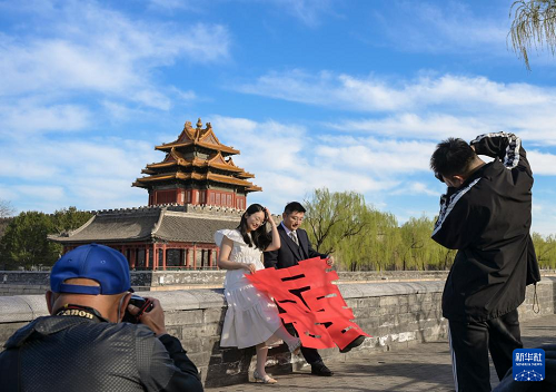3月25日,一對情侶在北京故宮角樓處拍攝新婚照片,吸引幾位攝影愛好者紛紛舉起相機記錄下春日里的浪漫一刻。(新華社記者 李賀 攝)