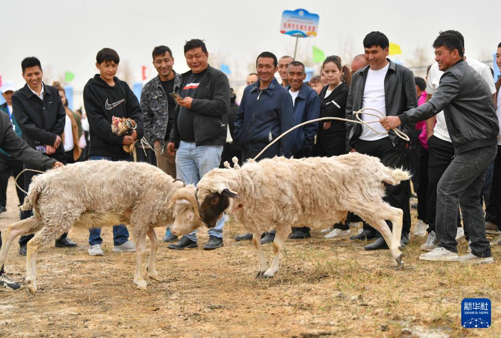 4月12日,人們在新疆于田縣先拜巴扎鎮(zhèn)農(nóng)牧民運(yùn)動(dòng)場觀看斗羊比賽。(新華社記者 胡虎虎 攝)