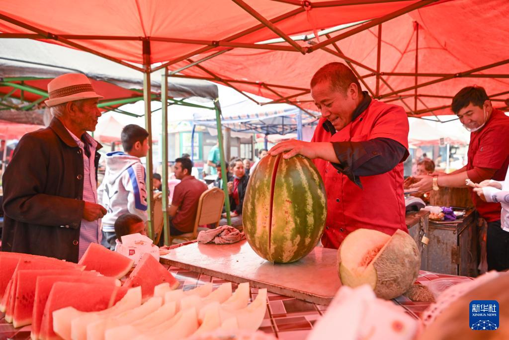 4月13日,一位商販在新疆于田縣先拜巴扎鎮(zhèn)農(nóng)牧民運(yùn)動(dòng)場為顧客制作面食。(新華社記者 胡虎虎 攝)