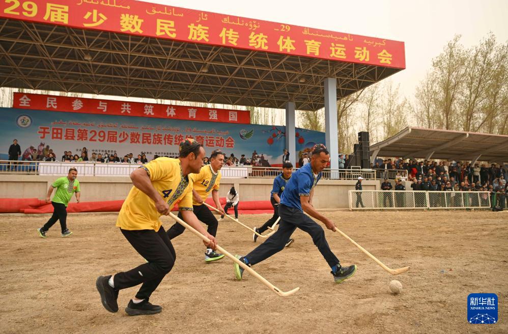 4月12日,村民在新疆于田縣先拜巴扎鎮(zhèn)農(nóng)牧民運(yùn)動(dòng)場參加叼羊比賽。(新華社記者 胡虎虎 攝)
