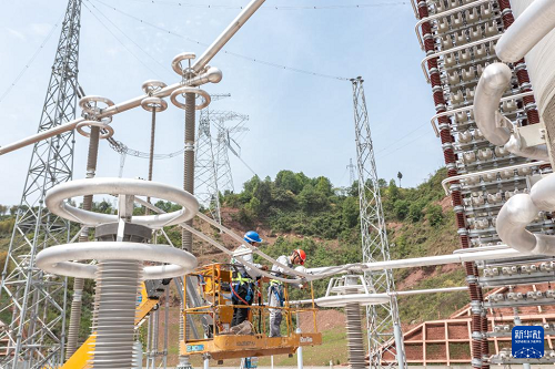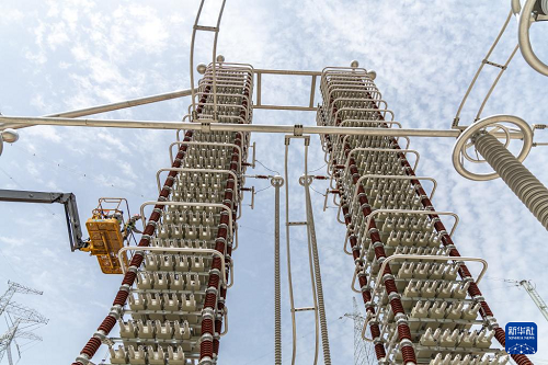 4月16日,安徽送變電工程有限公司施工人員在“疆電入渝”特高壓工程渝北換流站建設(shè)現(xiàn)場對電容器塔設(shè)備進(jìn)行調(diào)試驗(yàn)收。(新華社記者 黃偉 攝)