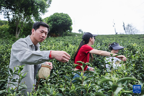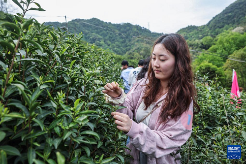 4月16日,參加茶文化主題活動的市民在建德市新安江街道嶺后大坪茶園體驗(yàn)采茶。(新華社記者 徐昱 攝)