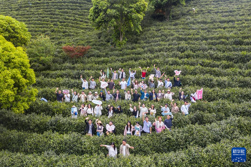 4月16日,參加茶文化主題活動的青年在建德市新安江街道嶺后大坪茶園合影(無人機(jī)照片)。(新華社記者 徐昱 攝)