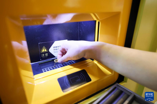 5月5日,在上海市普陀區(qū)一家商場(chǎng)內(nèi)的“智慧金店”,工作人員將用戶(hù)的黃金首飾放入智能黃金回收設(shè)備中。(新華社記者 王翔 攝)