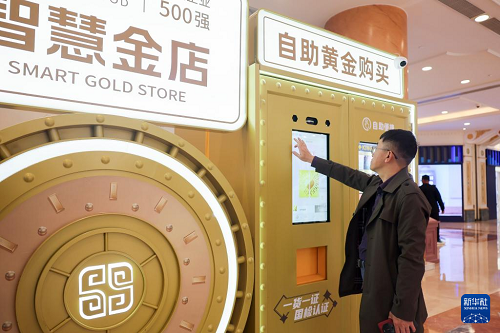 5月5日,在上海市普陀區(qū)一家商場(chǎng)內(nèi)的“智慧金店”,市民了解自助黃金購(gòu)買(mǎi)設(shè)備。(新華社記者 王翔 攝)