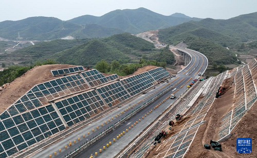 5月7日,工人在石太高速公路改擴(kuò)建項(xiàng)目建設(shè)工地施工(無(wú)人機(jī)照片)。(新華社記者 楊世堯 攝)