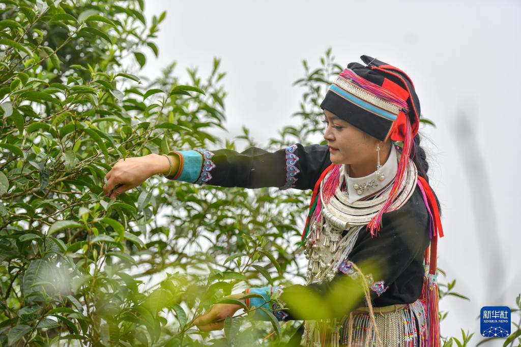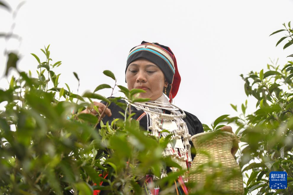 5月8日,茶農(nóng)在麻栗坡縣猛硐鄉(xiāng)的一處茶園采摘茶葉。(新華社發(fā) 彭奕凱 攝)