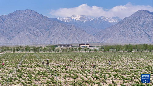 在位于寧夏銀川市賀蘭山東麓的海悅?cè)屎途魄f,工人在為葡萄藤抹芽、剪枝(無人機照片,5月9日攝)。(新華社記者 王鵬 攝)