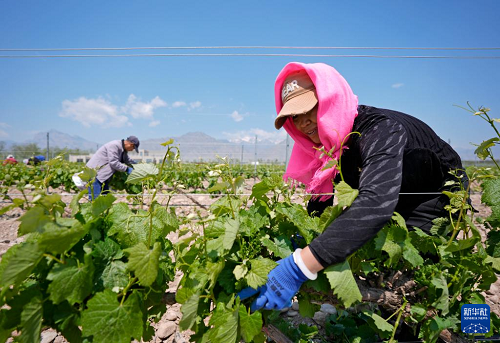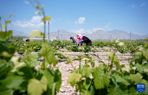 近日,寧夏賀蘭山東麓種植的釀酒葡萄進入結(jié)果關(guān)鍵期,當?shù)鼐魄f組織工人對葡萄藤進行抹芽、剪枝等管護工作,以保證葡萄長勢。