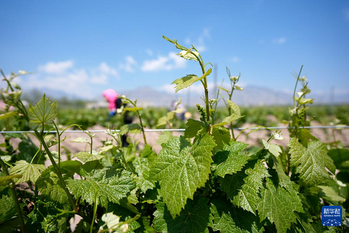 在位于寧夏銀川市賀蘭山東麓的海悅?cè)屎途魄f,工人在為葡萄藤抹芽、剪枝(5月9日攝)。(新華社記者 王鵬 攝)