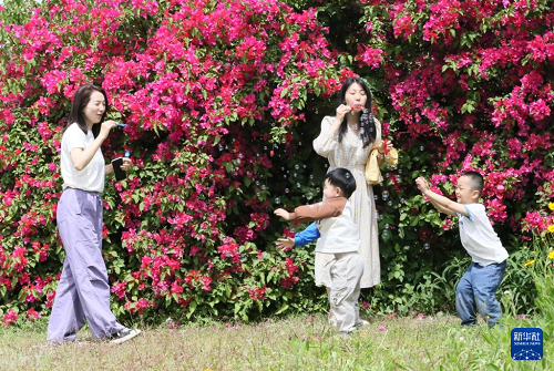 5月10日,在四川樂山三角梅花廊,家長帶著孩子玩耍。(新華社發(fā) 李華時(shí) 攝)