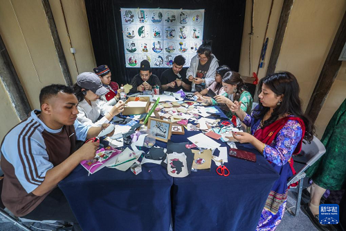5月12日,在濮院時(shí)尚古鎮(zhèn)的一家拼布工作坊內(nèi),外國(guó)游客在體驗(yàn)布藝創(chuàng)意拼貼。(新華社記者 徐昱 攝)